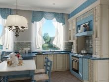 - В дървена къща светъл тюркоазен нюанс ще изглежда по -интересен. За да създадете стил в Прованс, например в кухнята, изберете завеси с малък модел. Съчетайте ги с покривка или възглавници за столове;