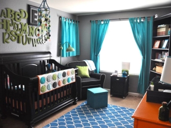 Чудесен вариант за тези, които са уморени от баналната розова стая за момиче и синя за момче. Използването на тюркоаз в детската стая е необичайно и много красиво..