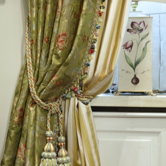 Tiebacks ви позволява да актуализирате скучния вид на завесите. Благодарение на този детайл върху завесите се появяват ефектни драперии, което прави завесите напълно различни на външен вид. В допълнение, сглобките помагат да се скрият дефектите на платното, така че трябва да се опитате да завесите завесите, преди да купите нови..