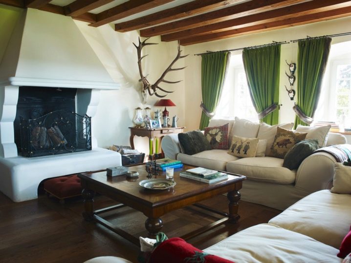 Използването на необичайни естествени материали не се ограничава само до дърво и кожа. Снимката показва вариант на скобите, изработени от козина. Поради избора на дискретен цвят, дизайнерът успя да ги впише хармонично в такъв ярък интериор, като същевременно не го претоварва..