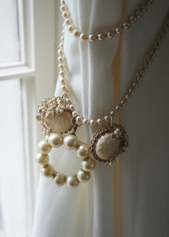 Добър пример за това как можете да използвате бижута като държачи. На тази снимка обикновена дамска гривна служи като пикап. Изработен е с метални елементи. Това освежава външния вид на завесите, прави го по -модерен и динамичен..