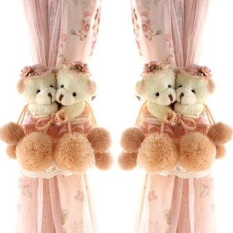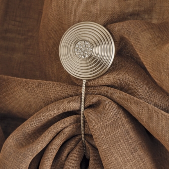 Често скучните мъниста получават втори живот, ако вземете завесите с тяхна помощ. Преплитането на камъни и вериги изглежда ефектно, бляскаво и елегантно. Изборът на контрастен цвят на камък или подходящ нюанс на завесата изглежда еднакво добре. Използването на медальони, вериги, метални копчета идеално ще се впише в селския “момичешки” Стил „изтъркан шик“. Не използвайте този тип скоби с тъмни завеси..