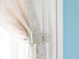 Оригинални държачи за кухненски завеси могат да бъдат направени с обикновена вилица и лъжица. Просто трябва да огънете дръжката според нуждите и захващането е готово. Интересно и смело решение би било да използвате чаша. Тази опция е подходяща само за леки завеси..