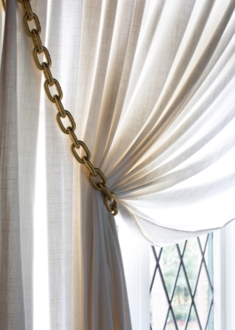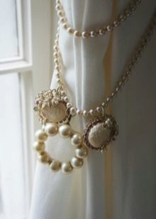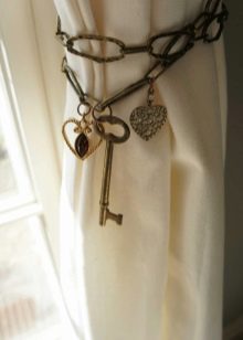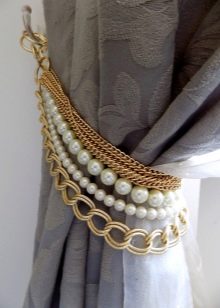 Добър пример за това как можете да използвате бижута като държачи. На тази снимка обикновена дамска гривна служи като пикап. Изработен е с метални елементи. Това освежава външния вид на завесите, прави го по -модерен и динамичен..