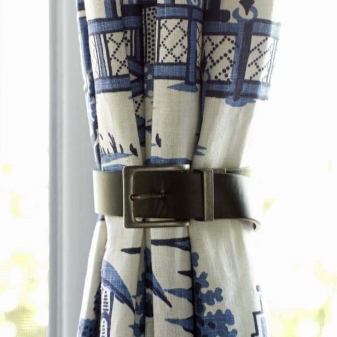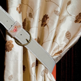 Доста често класическите черни колани се избират като пикап за завеси за шкафове. Опции от няколко ивици изглеждат по -интересни, както и модели на плитка. За по -малко официална стая, тирантите са чудесни..