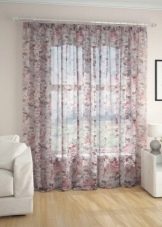 - Комбинирайки светли завеси с тюл в залата, можете да разгледате по -отблизо моделите с шарки. Бродерията върху воала, повтаряща модела и нюанса на декора на завесите, ще се впише идеално в интериора, добавяйки величие и празнична атмосфера в стаята.