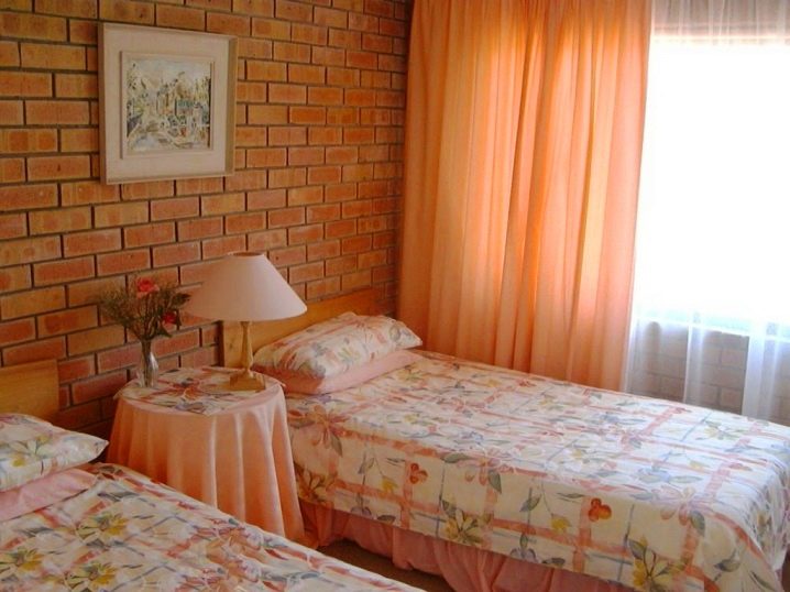 - За смесен стил праскова избрана детска градина летящ бял воал и по -плътна праскова, действаща като завеса. Пречупената светлина е боядисана в мек цвят с оранжев нюанс, което прави стаята по -уютна и топла. Воалът покрива и суровата тухлена зидария под прозореца..