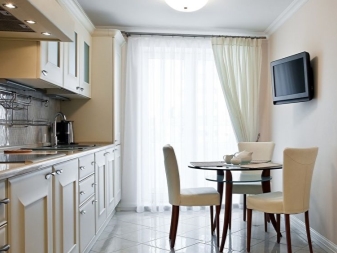 За кухнята обикновено се избират кратки опции до перваза на прозореца. За да изчислите правилната дължина на завесата, трябва да измерите дължината от пердето до перваза на прозореца и да добавите още 30 см, тъй като леката тъкан ще се издига от време на време..