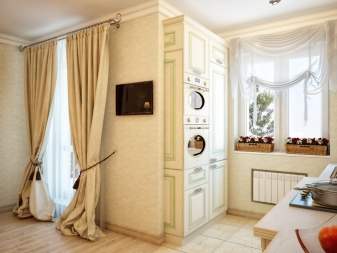 За кухнята обикновено се избират кратки опции до перваза на прозореца. За да изчислите правилната дължина на завесата, трябва да измерите дължината от пердето до перваза на прозореца и да добавите още 30 см, тъй като леката тъкан ще се издига от време на време..