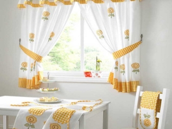 За кухнята са подходящи къси полиестерни завеси. Те са лесни за грижи, перат се в пералня в деликатен цикъл, а късите модели са по -малко податливи на замърсяване. Този момент е много важен за кухнята..