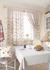 Комплектът с точки на точки ще се впише в кухнята, превръщайки се едновременно в един от акцентите на цялата композиция. Ненатрапчив модел ще помогне да се създаде интересен вид за целия прозорец и като цяло ще направи цялостния интериор по -жив и динамичен. Не избирайте черно -бели модели завеси. Зелените, сините, жълтите полка изглеждат много по -забавни и привлекателни. Трябва да бъдете изключително внимателни, когато избирате шарена шарка. Тънката тъкан не понася претоварване.