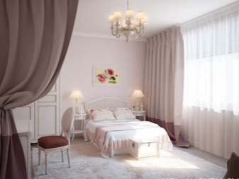 - Спалня в стил Прованс допълнен от удължен модел завеси от воала. Прозрачната структура на платното нежно разсейва светлината, правейки стаята по -романтична.