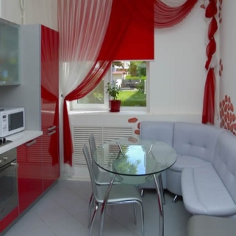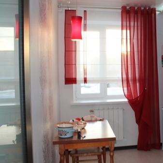 Изборът в полза на ярки завеси в този случай ще бъде отлично решение. Цветните завеси за кухнята трябва да се комбинират с останалата декорация на стаята. Ако цветът на цялостното обзавеждане се различава от сянката на избраните завеси, повторете същия нюанс в детайли. Приборите за маса или функционалните текстилни изделия ще бъдат чудесно допълнение.