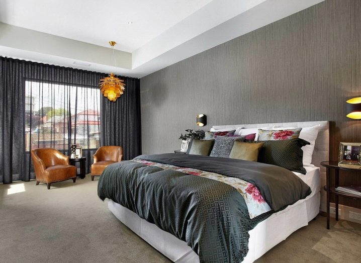 - В интериора на тази спалня дизайнерът се отказа от използването на завеси в полза на сгъстени ленени завеси вуали. Те едновременно защитават помещението както от светлина, така и от гледка от улицата, а също така ви позволяват да създадете усещане за безопасност и комфорт в стаята. Наситеният сив цвят се повтаря в обстановката (покривало за легло), което го прави да изглежда хармонично и подходящо.