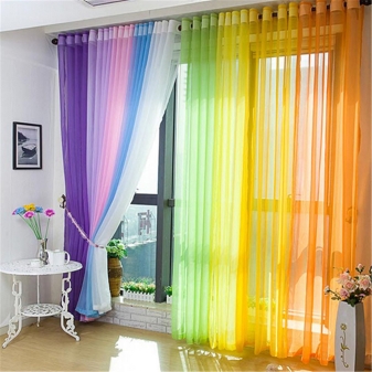 Съвременните дизайнери често пускат модели в два цвята или дори три цвята едновременно. Цветният воал “дъга” е подходящ не само за декориране на детска стая. Ще изглежда страхотно както в кухнята, така и в провинцията..