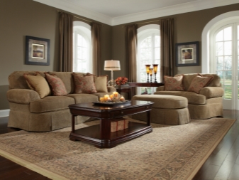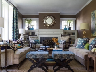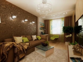 Основният принцип за създаване на хармоничен ансамбъл е да съответства на цвета на завесите, за да съответства на тапета. Кафявите тапети могат да бъдат студени или топли. За студен тон на тапета, партньорите ще бъдат златисти, житни, люлякови цветове на декора. Морков, жълт, червен, розов текстил съвпадат с топли кафяви тонове.