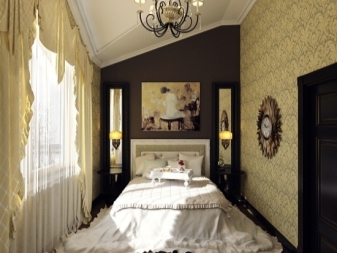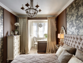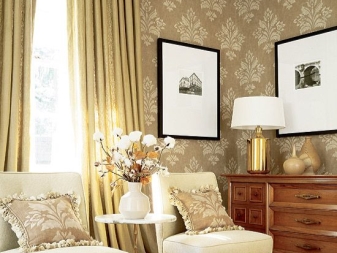 Третият вариант на дизайн е изборът на завеси от същия цвят като тапета, тоест кафяв. В този случай можете да направите стаята твърде мрачна. Ако обаче тапетът има ярък бял дамаски модел или златни монограми, завесите със същия модел или цвят ще създадат ансамбъл в класически стил..