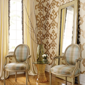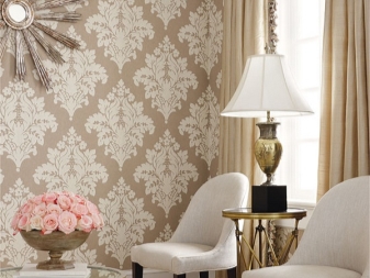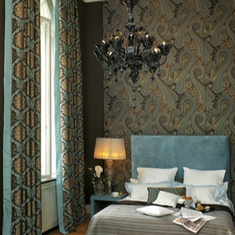 Тапетите с дамаски модел са идеално съчетани с обикновени завеси в цвета на шарката.