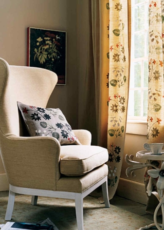 Важен нюанс при избора на плат за завеси е естествената светлина на стаята. В светли, слънчеви помещения текстилът в студени цветове е добър вариант. Светли маслинени, сиви, тюркоазени, сини материи ще освежат кафявия тон на стените.
