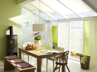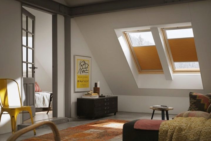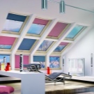 - Наклонените прозорци са перфектно допълнени от ролетни щори. Те напълно предпазват помещението от слънчева светлина, а околната среда от изгаряне. Това дизайнерско решение е приемливо за повечето интериори..