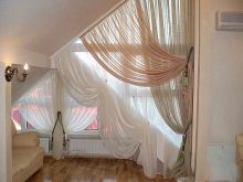 Таванско помещение с ъглови прозорци е истинска находка. Декорирането им с плътен тюл, окачен на корниз, свързващ двата прозореца, ще създаде лека, приятна атмосфера на тавана. Такива завеси придават хармония на цялата стая, визуално изглаждайки остър ъгъл..