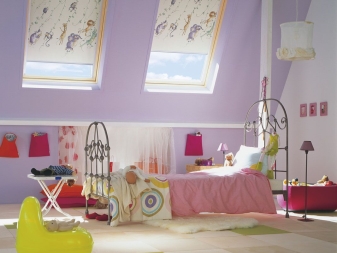 - Детска стая на тавана, чийто прозорец е украсен с пластмасови хоризонтални щори. Стаята изглежда лека и ефирна благодарение на изобилието от бяло в интериора. Липсата на традиционни завеси не вреди на общата атмосфера, тя все още е също толкова уютна и свежа..