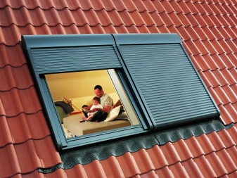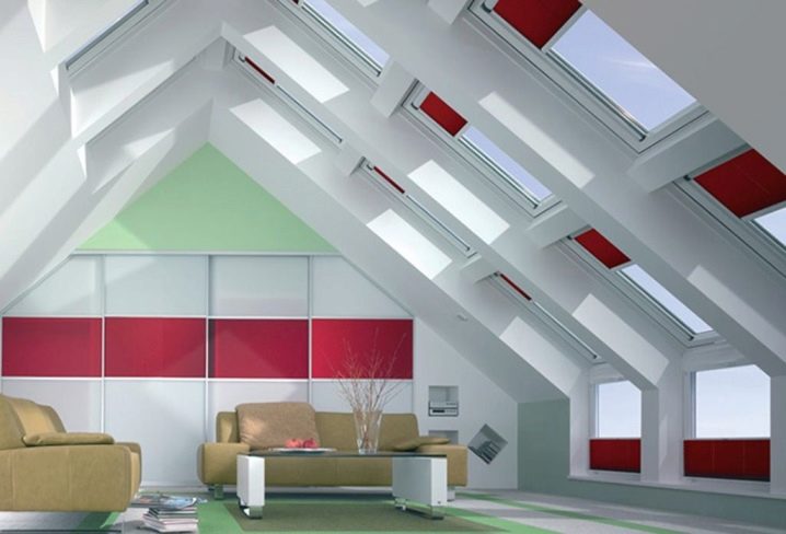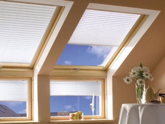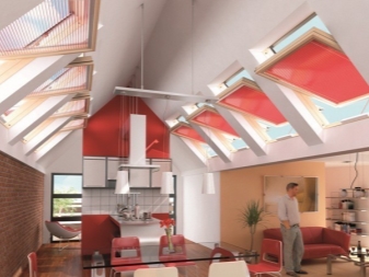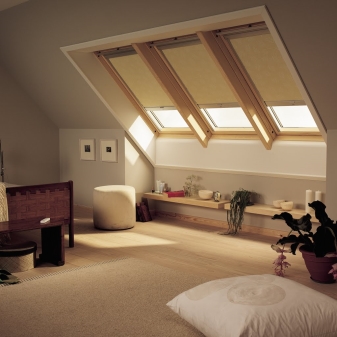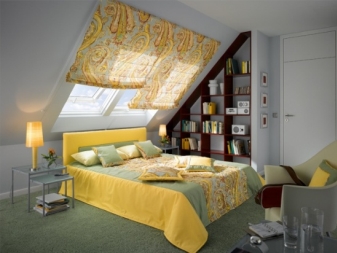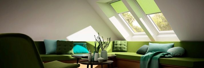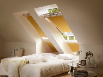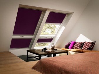 - Наклонените прозорци са перфектно допълнени от ролетни щори. Те напълно предпазват помещението от слънчева светлина, а околната среда от изгаряне. Това дизайнерско решение е приемливо за повечето интериори..