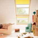 - Дизайн на тавански прозорец в еко стил не трябва да отвлича вниманието от основното обзавеждане на стаята. Достатъчно е да използвате бели ролетни щори, така че да се слеят с прозореца и да предпазват от слънчева светлина, като същевременно не пречат на преминаването му.