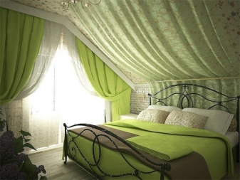 За стая с неравен таван завесите от леки материали също ще бъдат отличен вариант. Те ще отклонят част от вниманието към себе си, правейки стаята по -интересна и пропорционална. По -добре е да нарисувате таван с фаска в светъл тон и да изберете завеси с подобен нюанс.