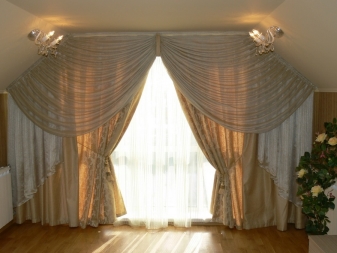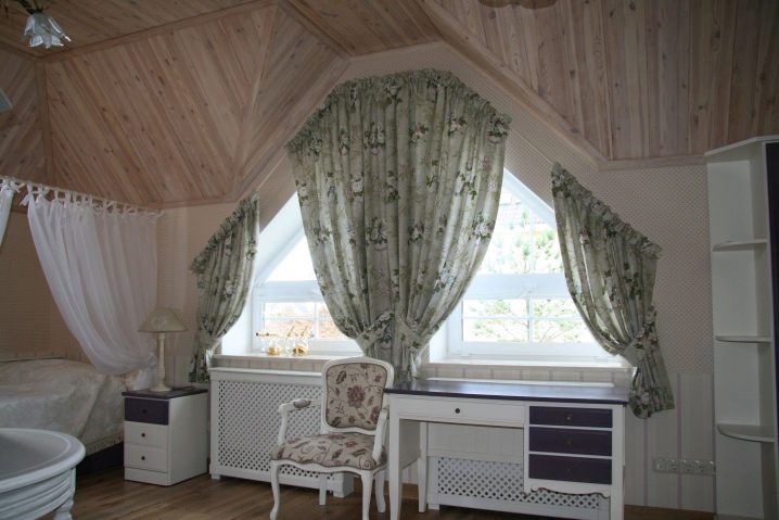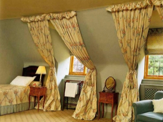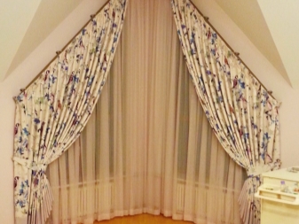 Таванско помещение с ъглови прозорци е истинска находка. Декорирането им с плътен тюл, окачен на корниз, свързващ двата прозореца, ще създаде лека, приятна атмосфера на тавана. Такива завеси придават хармония на цялата стая, визуално изглаждайки остър ъгъл..
