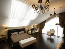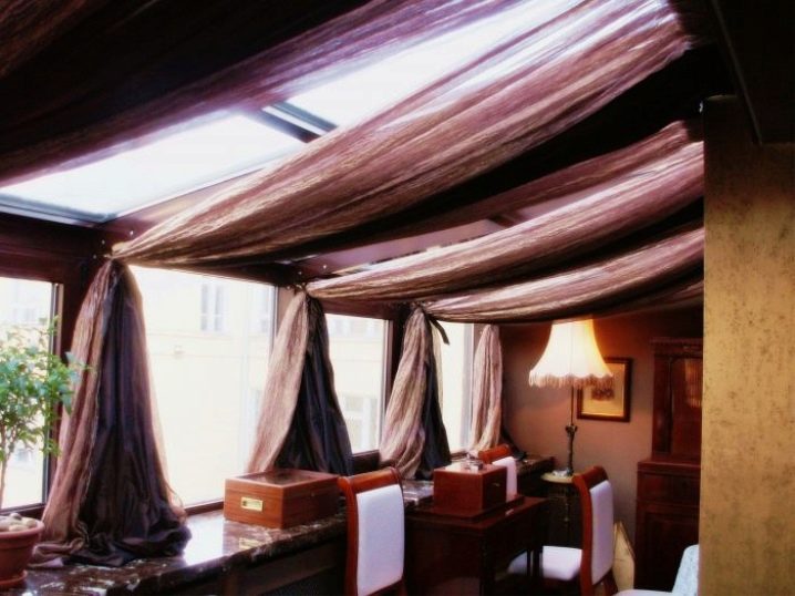 - Избор модели от плат достатъчно голям. Но не всички тези материали, които се използват при проектирането на завеси в къщата, ще бъдат подходящи на тавана. Например, тежки платове за завеси могат да бъдат окачени само на класически правоъгълен прозорец, тъй като тъканта не е подходяща за декориране на таван.