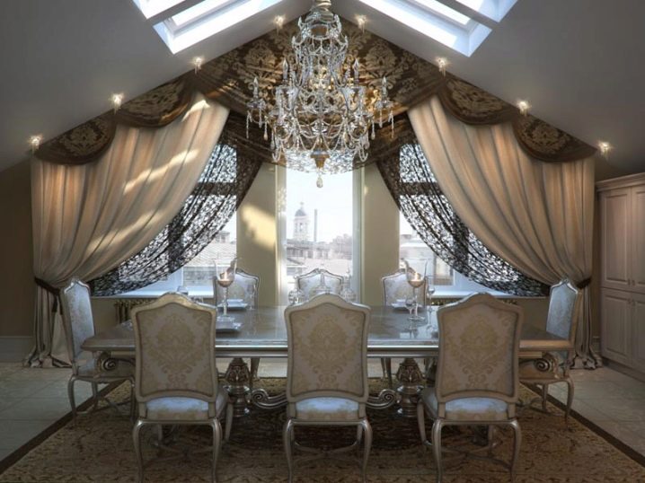 - Бароковата трапезария, разположена на тавана, по нищо не отстъпва по величие на големи зали с високи тавани. Триъгълният прозорец е рамкиран с леки завеси и тежки завеси, но цялостният вид на стаята не може да се нарече тежък. Само професионален дизайнер обаче може да постигне този ефект..