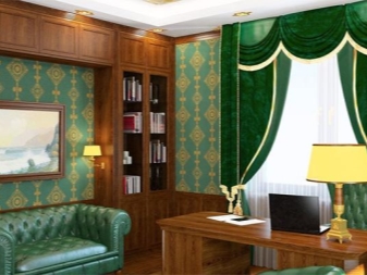 - Кабинет. Зеленото в работна среда ви помага да се съсредоточите и да вземате решения. Изумрудените и малахитовите тонове, съчетани със златни и кафяви цветове, ще изглеждат най -добре тук. Те ще направят интериора бизнес подобен и уважаван..