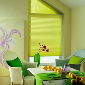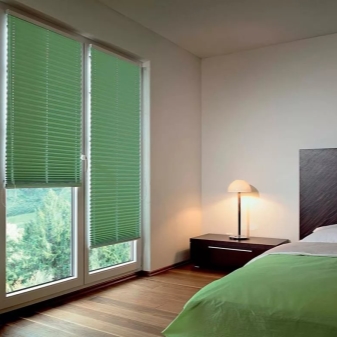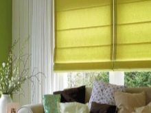 В стая с ниски тавани е по -добре да закачите обикновени зелени завеси без шарки. Също така трябва да правите без излишни украси и драперии. В идеалния случай, използването на ролетни или римски щори.