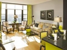 - Сиво и зелено Това е друга класическа цветна двойка. Тези нюанси се допълват и изглеждат красиви и спокойни заедно. Така че, сива стая ще оживее, ако окачите ярки завеси на прозорците. Зеленото се комбинира и с други цветове: ментов нюанс със злато привлича вниманието; розово-зелената комбинация е подходяща за детската стая; комбинацията с червени тонове е характерна за етническите мотиви.