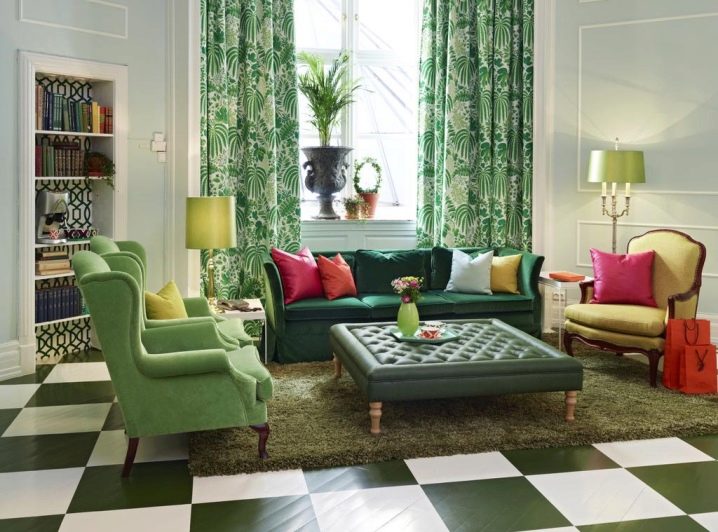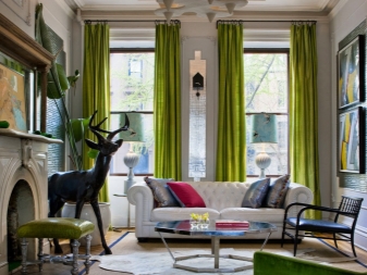 - Хол. Зелените завеси в хола ще се впишат идеално в естествената тема на интериора. Светлите нюанси визуално ще увеличат пространството, а богатите изумрудени завеси ще добавят яркост към атмосферата. Трябва обаче да внимавате да не прекалявате с допълнителни ярки елементи в залата..