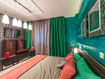 - Спалня. Зеленото е идеално за спалня. Тъмнозелените нощни завеси могат да се комбинират със светло бял тюл. Тази комбинация има положителен ефект върху съня. Нефритовият нюанс върху непрозрачно платно ще успокои очите, докато чаеното зелено е подходящо за дневни завеси..