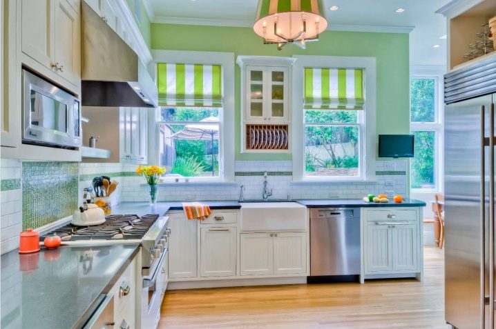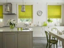 - Кухня. Различни пастелни зелени завеси ще успокоят атмосферата и ще предотвратят преяждането. Но зеленото с преобладаване на жълтото, напротив, ще добави енергия и ще разпали апетита ви. Обикновено компактните къси завеси се окачват в кухнята поради малкия размер на стаята. Например, светлозелени римски завеси с шарка ще бъдат добър вариант..